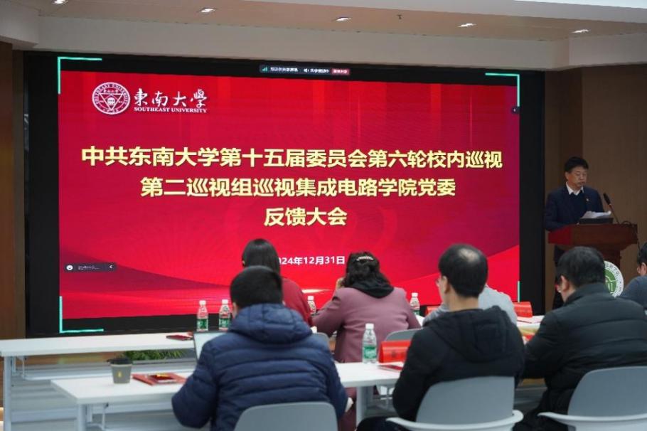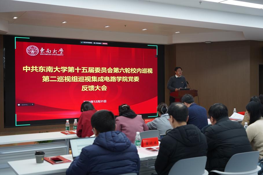 2024年12月31日,中共东南大学第十五届委员会第六轮校内巡视第二巡视组巡视英国365集团官网党委反馈大会在九龙湖校区电子信息大楼14楼报告厅召开,并在无锡校区两江院报告厅设置分会场。校党委常务副书记刘攀出席会议,东南大学党委第二巡视组全体组员,党委巡视工作办公室、党委组织部、校纪检监察部门主要负责人,英国365集团官网党委领导班子和教师、学生、退休教职工代表共同参会,会议由英国365集团官网院长孙伟锋主持。在反馈会前,巡视组组长与学院党政主要负责人进行了情况沟通。