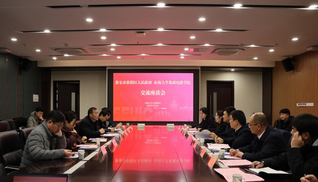 参观结束后,双方举行了交流座谈会,东南大学无锡校区管委会副主任朱真代表无锡校区致辞欢迎辞,热烈欢迎何区长一行的到来,随后英国365集团官网徐申副院长介绍了学院情况。何区长对淮阴区主要产业及荣芯半导体等龙头企业进行了介绍,并希望通过此次机会与英国365集团官网深入开展产学研协同合作。在交流讨论环节,孙伟锋院长围绕深化校企科技合作、拓展平台建设、人才双聘等内容提出看法,并为淮阴区时代芯存半导体的发展提出了建设性意见。