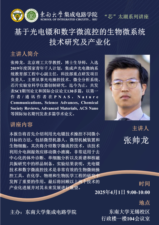 【芯太湖讲座】基于光电镊和数字微流控的生物微系统技术研究及产业化