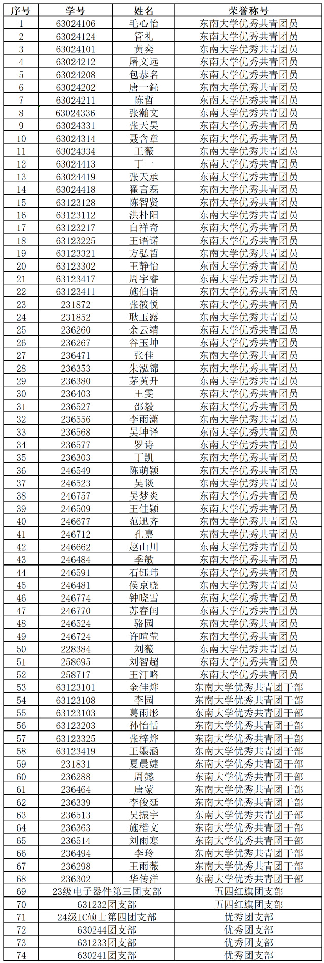 根据《关于开展东南大学2024年度“两红”“两优”评选表彰工作的通知》,坚持“公平、公正、公开”的原则,经个人申请、各团支部提名申报、各团支部评议审核、学院团委组织评审,优秀团员、优秀共青团干部、优秀团支部、五四红旗团支部拟推荐名单如下,现进行公示,公示期2025年4月18日-4月20日,如有异议,请发送邮件至103009296@seu.edu.cn。