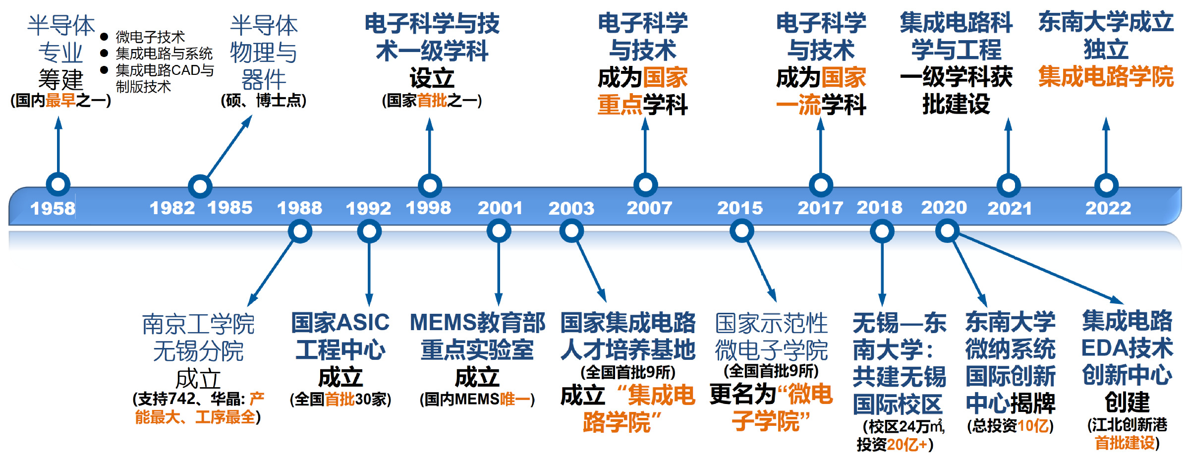 东大前身原南京工学院1958年创立了全国首批半导体专业,1988年与无锡市、原电子工业部、华晶电子集团联合创办了南京工学院无锡分院,已经历经35周年,是一个典型的政产学研合作模式,可以说率先开启了我国集成电路卓越工程师培养模式的探索。1992年东大国家集成电路领域仅有的两个工程中心之一:ASIC工程中心;于2001年成立国内MEMS领域唯一的MEMS教育部重点实验室;为承担首批国家集成电路人才培养基地的建设任务,2003年成立了全国首家英国365集团官网,后与电子学院合署建设办公;2021年建设首批集成电路科学与工程一级学科;2022年获批全国首家“国家集成电路设计自动化技术创新中心”。